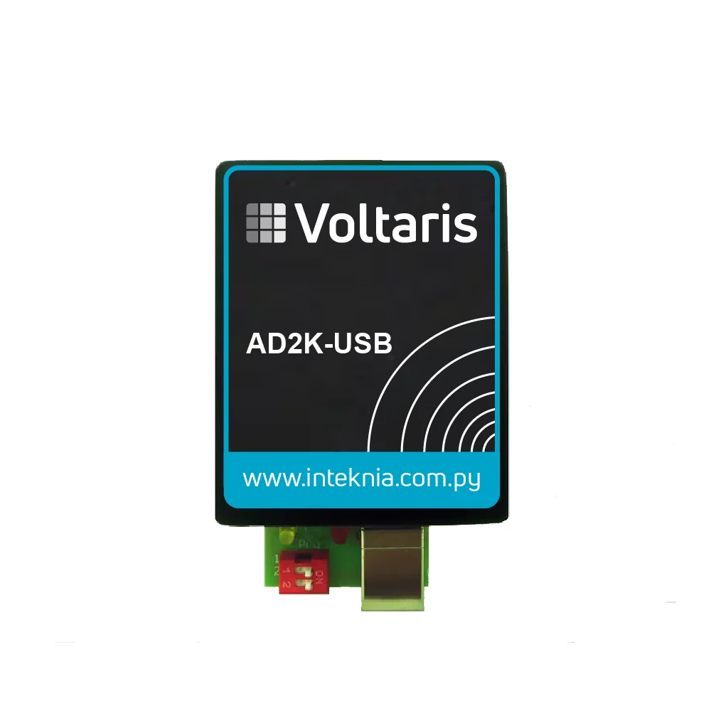 La interfaz de comunicación se gestiona a través de un puerto COM virtual, generado automáticamente al conectar el AD2K-USB a la computadora mediante su conector USB tipo B. Su velocidad de transmisión es configurable entre 2.400 y 57.600 bps, permitiendo la integración con distintos sistemas electrónicos. Además, su alimentación proviene directamente del puerto USB, eliminando la necesidad de una fuente de energía externa.