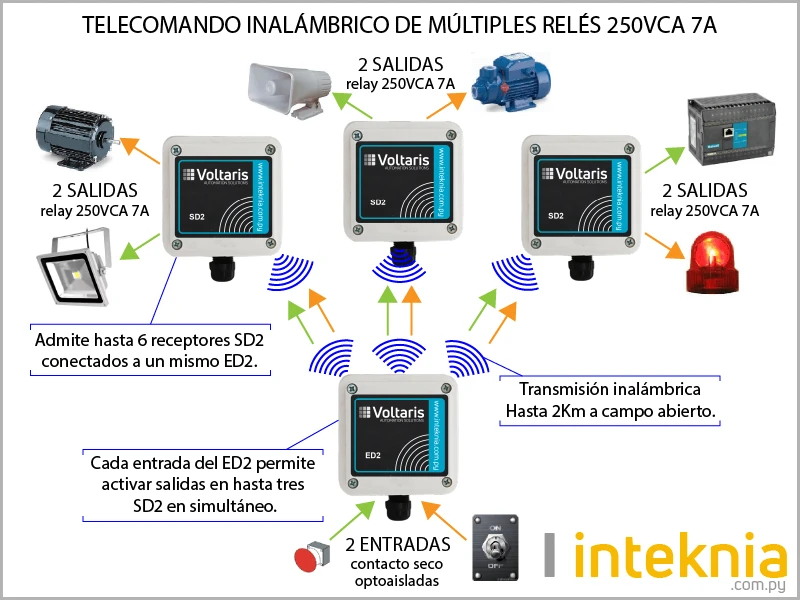 El SD2-2K es un modulo con 2 salidas de relé de contacto seco, compatible con enlaces inalámbricos de hasta 2 Km, para el control remoto de dispositivos eléctricos, lo que permite activar o desactivar equipos a distancia y sin cableados.